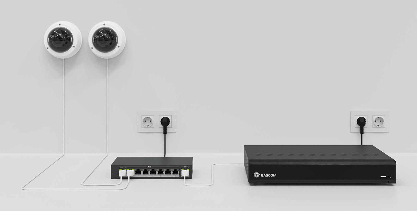 Mit einem PoE-Switch können Sie Ihr Kamerasystem nahtlos in ein bestehendes Netzwerk integrieren. Der Switch verbindet die Kameras mit dem Netzwerk und versorgt sie gleichzeitig mit Strom. Durch Anschließen des Rekorders an das Netzwerk wird automatisch eine Verbindung zu den Kameras hergestellt.
